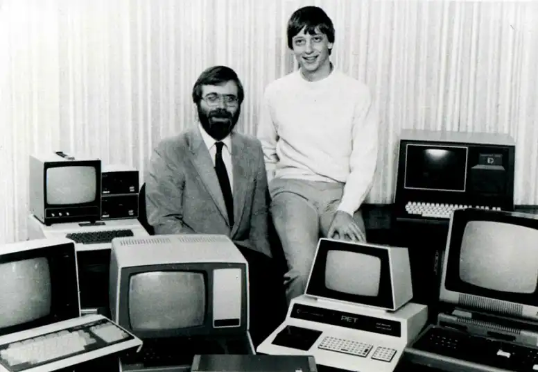 В 1980 году IBM обратились к Майкрософт для создания базового интерпретатора для IBM PC, как это было сделано с Altair 8800. Соучредитель Майкрософт Пол Аллен, слева, и Билл Гейтс позируют для International Business Machines после подписания контракта на разработку программного обеспечения с IBM 19 октября 1981 года.