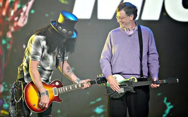 13. Билл Гейтс с игровым контроллером Xbox 360 Guitar Hero, наблюдает за игрой на гитаре Slash во время Международной потребительской выставки электроники в 2008.