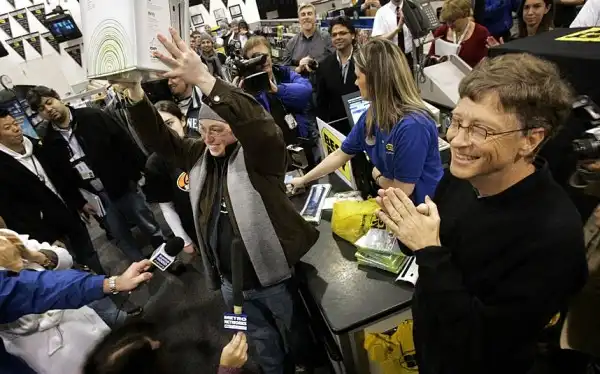 8. Покупатель Дэн Фридман держит новый Microsoft Xbox 360, он совершает первую покупку в Магазине Best Buy в 2005. Билл Гейтс сделал всем сюрприз, появившись в магазине, чтобы увидеть, как идут продажи.