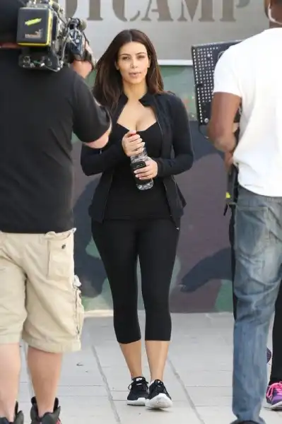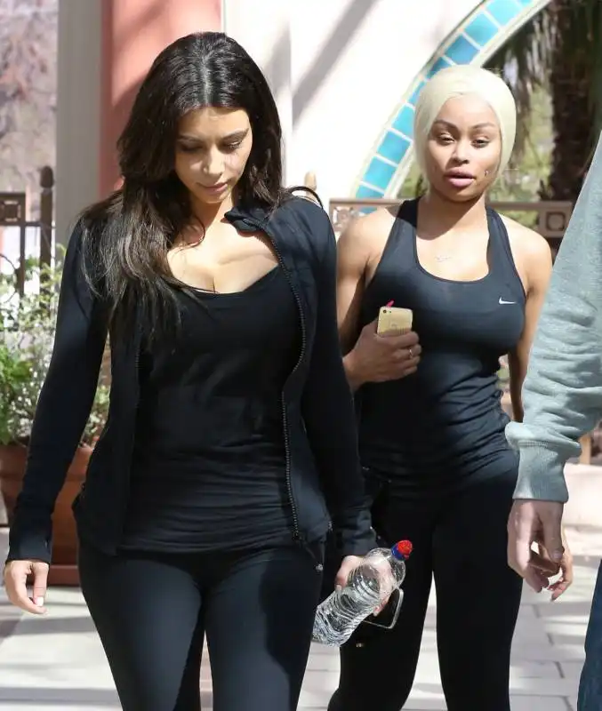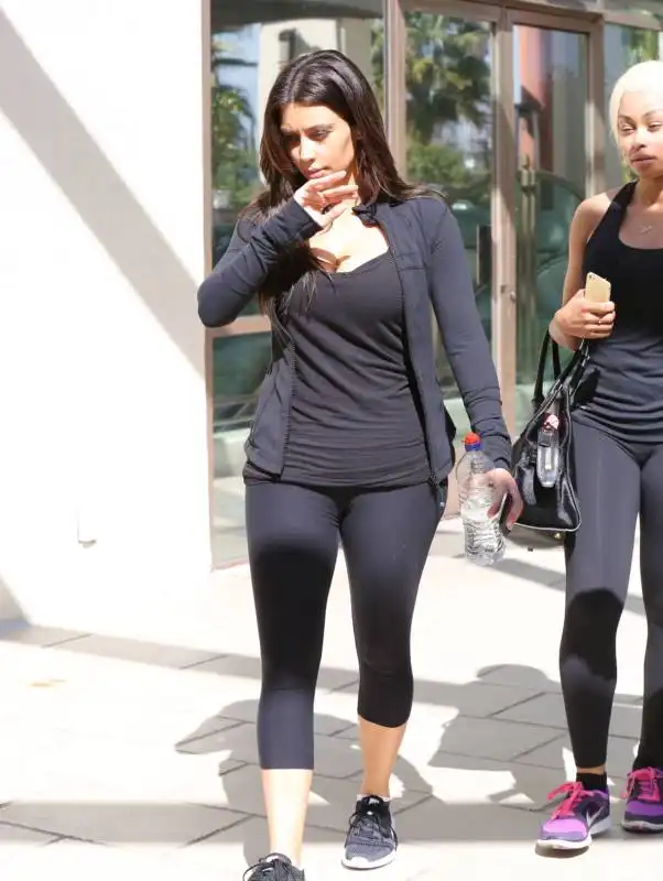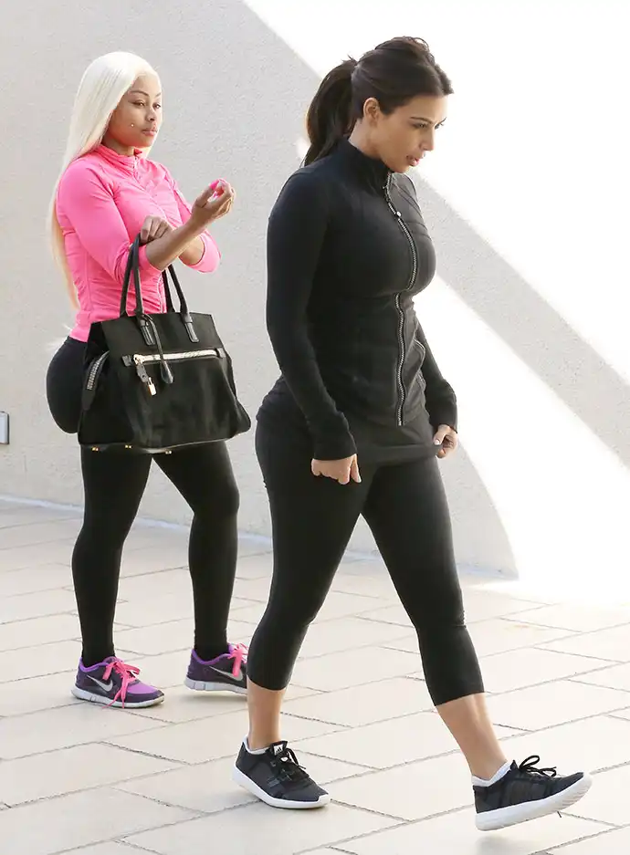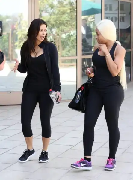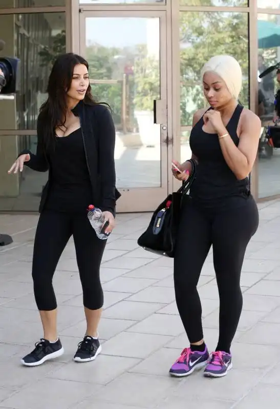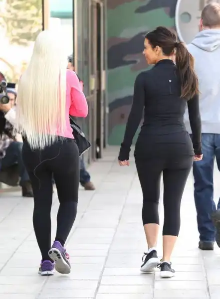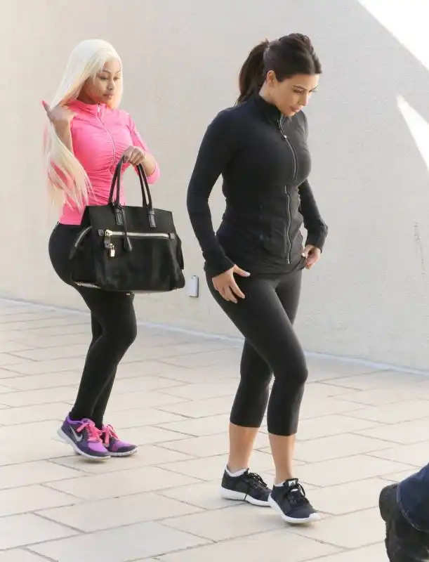 По сравнению с задом Блэк Чайны даже знаменитые на весь мир ягодицы Ким кажутся скромными, однако их дружбе это не мешает, поэтому девушки регулярно бывают замечены вместе. На этот раз они отправились в спортзал в обтягивающих фигуры спортивных костюмах. Ким, которая 24 мая в Париже сыграет свадьбу с рэпером Канье Уэстом, была одета в форму американского бренда одежды для йоги и фитнеса Lulu Lemon.
