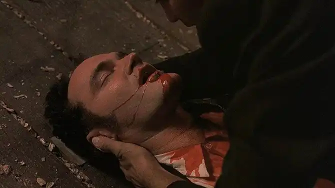 Кадр из фильма «От заката до рассвета». Джордж Клуни в роли Сета Гекко — брата Ричарда, вместе с которым они, спасаясь от правосудия, берут в заложники троих человек и успешно пересекают мексиканскую границу, но останавливаются на ночь в баре, кишащем вампирами