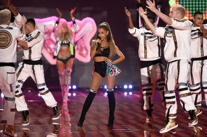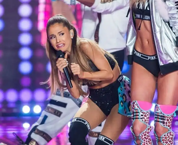 Американская певица Ариана Гранде, выступавшая на модном показе новой коллекции Victoria’s Secret, получила легкий удар от крыльев, с которыми на подиум вышла одна из моделей. Судя по выражению лица, 21-летняя поп-дива не на шутку перепугалась.