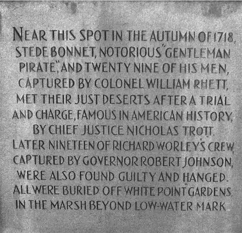 «Рядом с этим местом осенью 1718 года Стид Бонне, достославный пират‑джентльмен, и еще 29 его людей, взятых в плен полковником Уильямом Реттом, получили по заслугам после вошедших в историю разбирательства и приговора верховного судьи Николаса Тротта. Впоследствии девятнадцать человек из команды Ричарда Уорли, арестованных губернатором Ричардом Джонсоном, также были найдены виновными и повешены. Все они были преданы земле у сада Уайт Пойнт на тропе напротив отметки о мелководье».