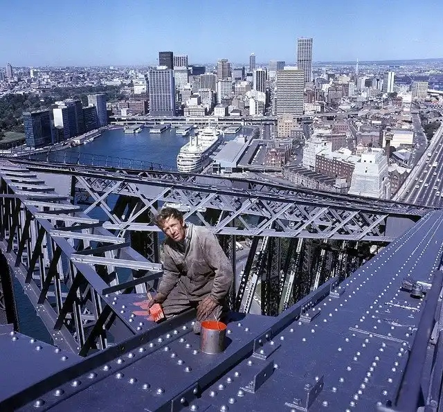 Это монтажник–высотник Пол Хоган, сидящий на одном из самых больших стальных арочных мостов в мире Харбор–Бридж. Фото сделано за 13 лет до получения актером премии «Золотой Глобус» за лучшую мужскую роль в фильме «Крокодил Данди».