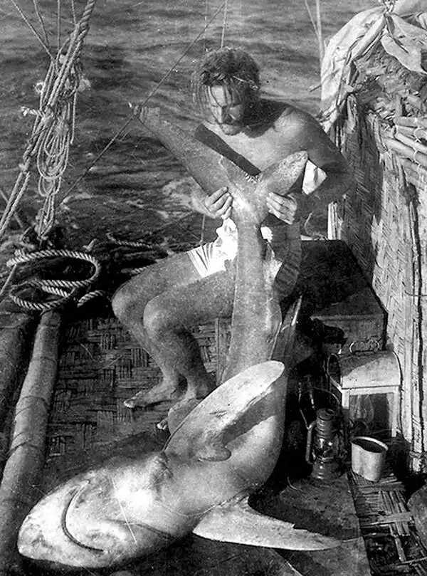 Плот под названием «Кон-Тики», на котором находился Хейердал и шестеро его спутников, вышел из перуанского порта Кальяо 28 апреля 1947 года. На парусе был изображен портрет перуанского вождя. Путешествие длилось три с лишним месяца и все это время отважные путешественники мужественно переносили тяготы пути, непогоду, голод и жажду.