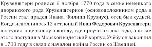 В жизни Ивана Федоровича присутствует множество интересных фактов, например известно, что он занимался спортом даже у себя на корабле (ежедневно упражнялся с 2-х пудовыми гирями), очень любил животных и один из его любимцев плавал всегда с ним. Это был спаниель, и поговаривают, что перед каждым выходом из порта команда трепала собаку за длинные уши – люди были убеждены, что после этого «обряда» плавание должно пройти успешно. И на самом деле оно так и было. Так же небезызвестный кот Матроскин (из мультфильма «Простоквашино») утверждал, что под командованием Крузенштерна плавала его бабушка, а минутой позже адмирала и вовсе перепутали с Дедом Морозом.