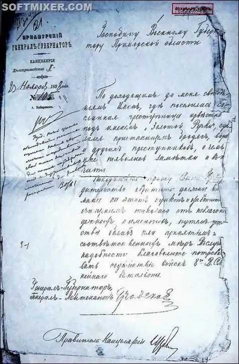 Приамурский генерал-губернатор Гродеков. 23 ноября 1898 года направляет секретный циркуляр № 10б Военному губернатору Приморской области, в коем под грифом «СЕКРЕТНО» пишет: