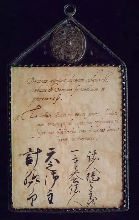 Что же касается латинского и японского текстов на лицевой стороне таблички, то они представляют начальные строки из двух псалмов Давида. Латинский текст гласит: "Dominus regnavit, decorem indutus est, indutus est Dominus fortitudinem et praexinxit se - Господь царствует. Он облечен величием, облечен Господь могуществом и препоясан" (Пс. 92:1).