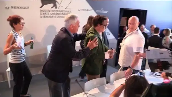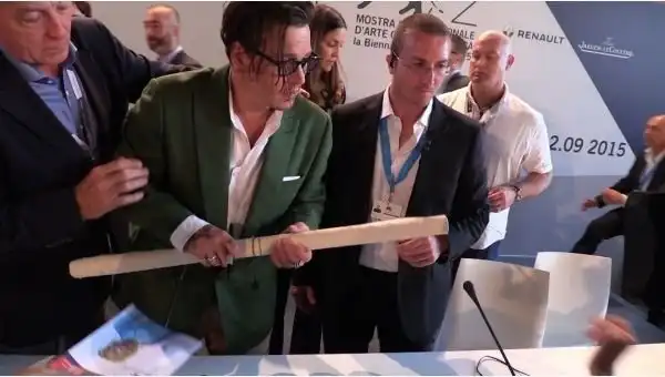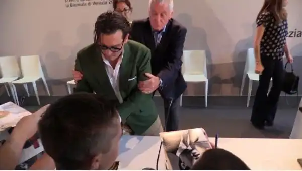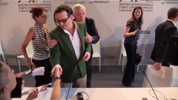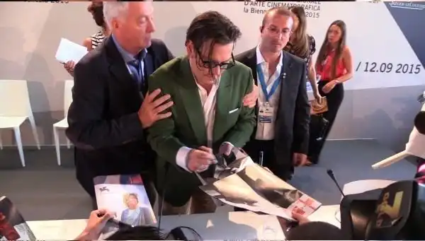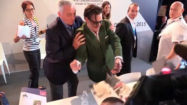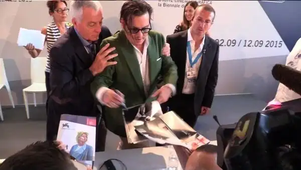 На Веницианском фестивале Джонни Депп начал раздавать автографы людям, пришедшим посмотреть на своего кумира. Люди, сопровождающие звезду, явно не хотели давать ему этого делать и всячески пытались выпроводить актера. Но Джонни повел себя без всякого пафоса и всё же раздал несколько автографов фанатам. А также, принял от одного из них подарок в виде какого-то рулона. Достойно!