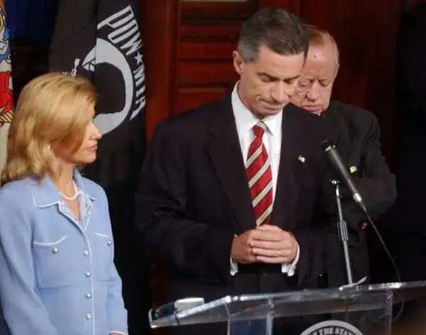 Бывший губернатор Нью-Джерси Джеймс МакГриви был женат на канадке Карен Джоан Шульц в течение шести лет. Затем он женился второй раз, на Дине Матос из Португалии. На фото выше как раз заснят момент, когда губернатор объявляет о своей отставке во время пресс-конференции в Трентоне, Дина стоит рядом с ним. Позже МакГриви признал, что он гомосексуал, и у него была связь с мужчиной. Сейчас бывший губернатор живет с мужем, преподавателем права в Университете Кин в Нью-Джерси.
