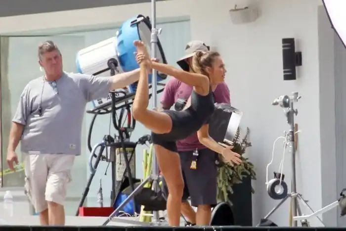 Американская актриса Джессика Альба, родившая двоих детей, в свои 34 года остается в отличной форме, что она продемонстрировала во время съемок рекламного ролика в Лос-Анджелесе. Помимо заводной фигуры Джессика обладает еще и неплохой растяжкой.