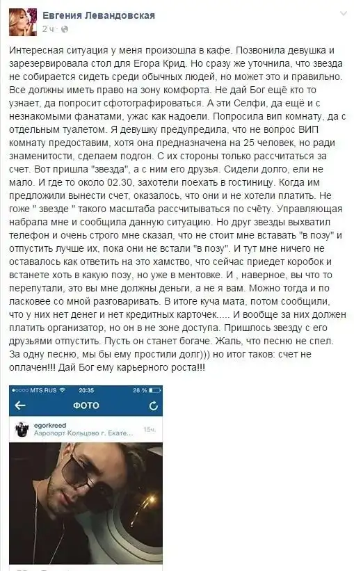 Российский певец Евгений Крид отказался платить за счет, который ему выставили в одном из ресторанов Екатеринбурга, где он отдыхал после концерта в компании друзей. Об этом инциденте стало известного благодаря директору ресторана Евгении Левандовской, описавшей всю историю на своей странице в соцсети. 21-летний артист вместе со своими друзьями устроил скандал и покинул заведение, так и не оплатив счет в размере 10 000 рублей. За отдых певца рассчитались организаторы концерта на следующий день.