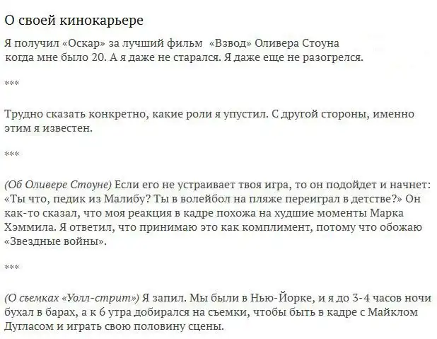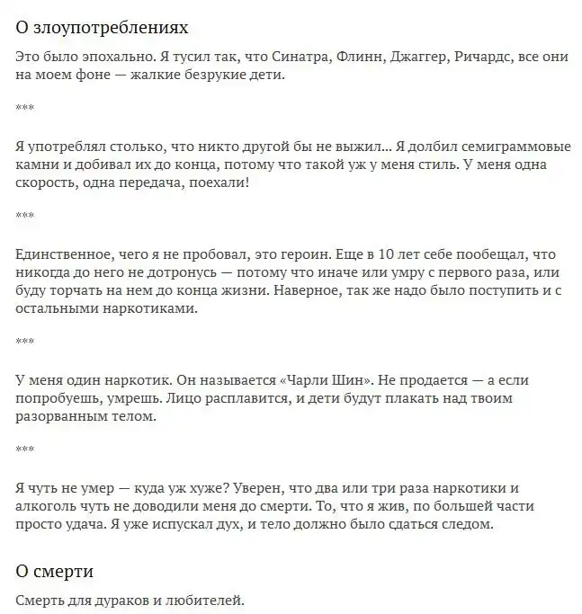 Актер Чарли Шин, недавно объявивший себя ВИЧ-инфицированным, известен своими неординарными выходками, дебошами, скандальными заявлениями и частой сменой сексуальных партнерш (только за последние 2 года их у него было около 200). Несмотря на свой образ жизни, Чарли Шин способен удивить красноречием своих высказываний и самые запоминающие его высказывания ждут вас далее.