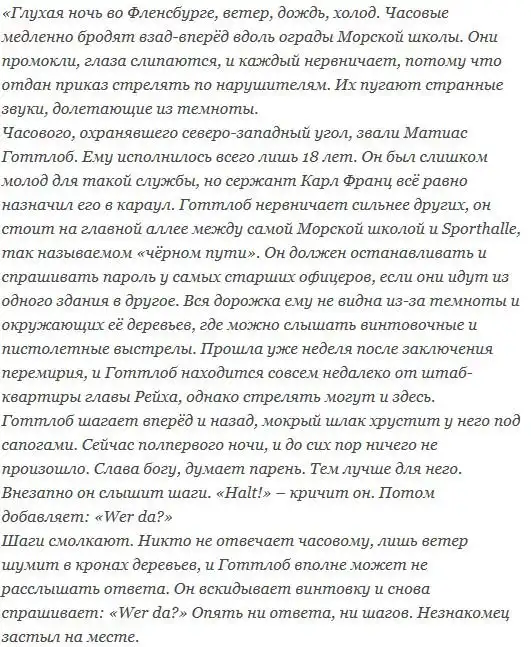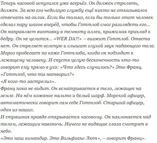 В случае необходимости подводный ас мог бы прибегнуть к более верному способу – к примеру, пойти по пути адмирала фон Фридебурга и воспользоваться своим личным оружием. Очевидно, что гибель Люта от пули часового была случайностью или цепью нелепых случайностей, которые столь подробно описывает Воуз в своей книге. На тот момент Лют действительно мог быть не лучшей физической и нервной форме – его внимание могло быть рассеянным, а действия неуверенными. Ввиду плохой погоды он мог вовремя не услышать криков часового и не назвать ему пароль – «Танненберг»…