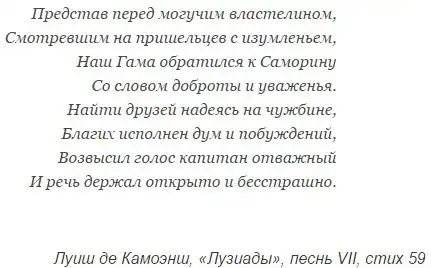 На протяжении всей дороги за процессией следовал народ – все жители Каликута вышли посмотреть на неведомых пришельцев. К воротам дворца пришлось буквально проталкиваться. Оказавшись, наконец, во внутреннем дворе, португальцы встретились с заморином. Васко да Гама произнёс долгую и пламенную речь, достойную золотого фонда дипломатических выступлений. Он рассказал, что представляет великого и могучего короля Португалии, чьи огромные флотилии бороздят морские глади, и что король этот, в своей милости и великодушии, послал его, Гаму, принести мир, дружбу и прочные торговые связи на далёкие индийские берега. Не ради золота и серебра, продолжал португалец, ибо этого добра в Португалии хватает, но из лучших сердечных побуждений.