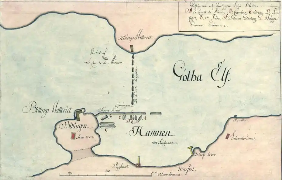 Торденшельд, воодушевлённый большим успехом, решил попытать счастья у Гётеборга. К тому времени к городу уже подошли датские сухопутные части, поэтому адмирал решил сосредоточиться на островных батареях Хизингена (островок, расположенный между двумя рукавами Гёта-Эли). Покинув Марстранд утром 1 августа, он был перед устьем реки у Гётеборга уже в полдень. Под началом адмирала имелись следующие силы: