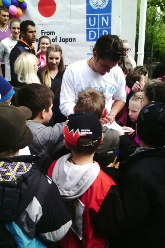 27 апреля известный голливудский актер Орландо Блум посетил украинские города Святогорск, Славянск и Краматорск. Приезд кинозвезды в качестве посла доброй воли ООН должен был пройти без лишней шумихи, так как о нем не сообщали даже официальные сайты и страницы ЮНИСЕФ в соцсетях. В Славянске звезда «Пиратов Карибского моря» и «Властелина колец» побывал в школе №13, в Краматорске он заглянул в местное арт-кафе. Школьники не упустили возможности сфотографироваться с актером и взять у него автограф.