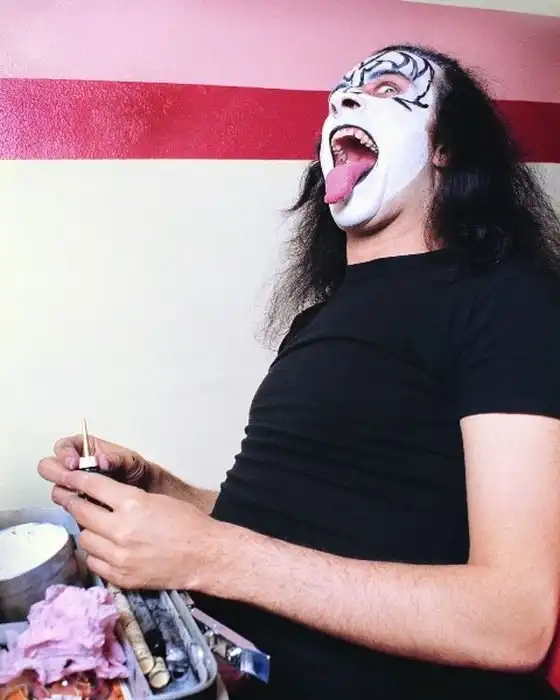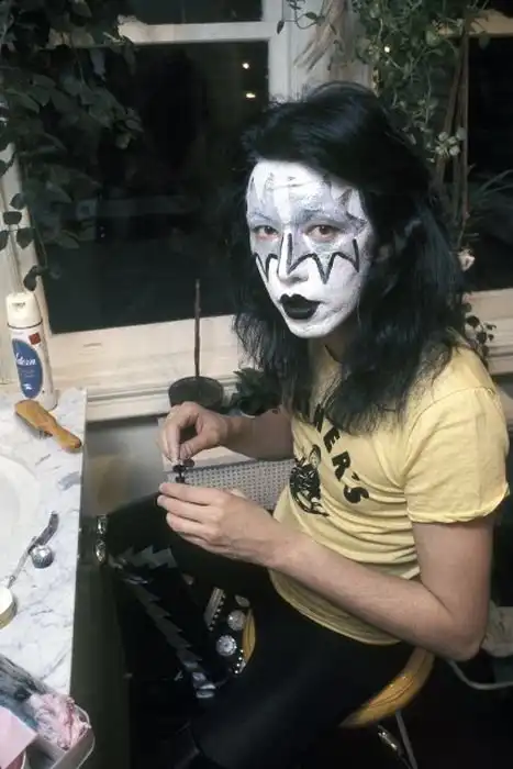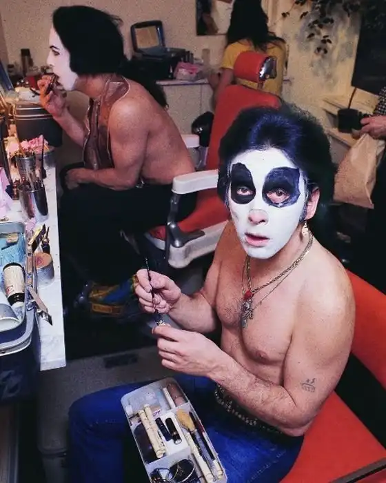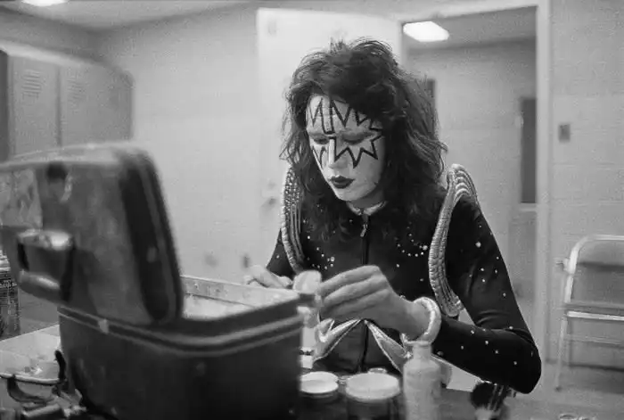Далее предлагаем взглянуть на редкие кадры, сделанные в гримерке американской рок-группы «Kiss». На этих фото музыканты наносят свой знаменитый грим, без которого не обходилось практически ни одно их выступление в 70-х годах. Каждый участник группы имел свой неповторимый образ, Джин Симмонс выходил на сцену в образе демона, Питер Крисс был котом, Эйс Фрейли называл себя «космическим тузом», а Пол Стэнли выбрал для себя образ «звёздного дитя».