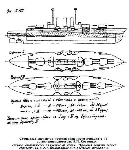 Было разработано несколько вариантов кораблей, вооруженных 16-дюймовыми орудиями главного калибра в двух- или трехорудийных башнях. Предложенный Костенко состав системы конструктивной противоторпедной защиты корпуса стал классическим для большинства проектов тяжелых артиллерийских кораблей, разработанных на рубеже 20-х годов, а полная ширина бортового защитного слоя проекта линкора 1917 г. была наибольшей среди всех этих проектов. Но наступил 1917 год со всеми нелегкими для России событиями, и стране стало совсем не до кораблестроения.