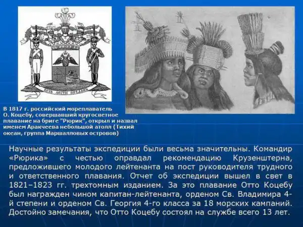 Через три года после окончания экспедиции в Петербурге было издано двухтомное сочинение Коцебу «Путешествие в Южный океан и Берингов пролив», а еще через пару лет вышел третий том, в котором были собраны статьи других участников экспедиции, а также записи научных наблюдений. Уже в 1821 г. записки Коцебу были переведены и изданы на английском, немецком и голландском языках.