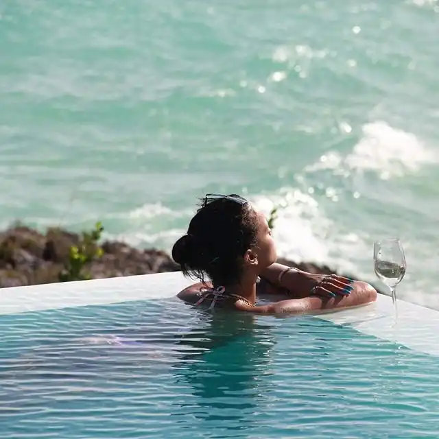 На опубликованных фотографиях Рианна демонстрирует аппетитные ягодицы и подтянутое тело. Известная певица запечатлена отдыхающей у бассейна с бокалом вина в руках.