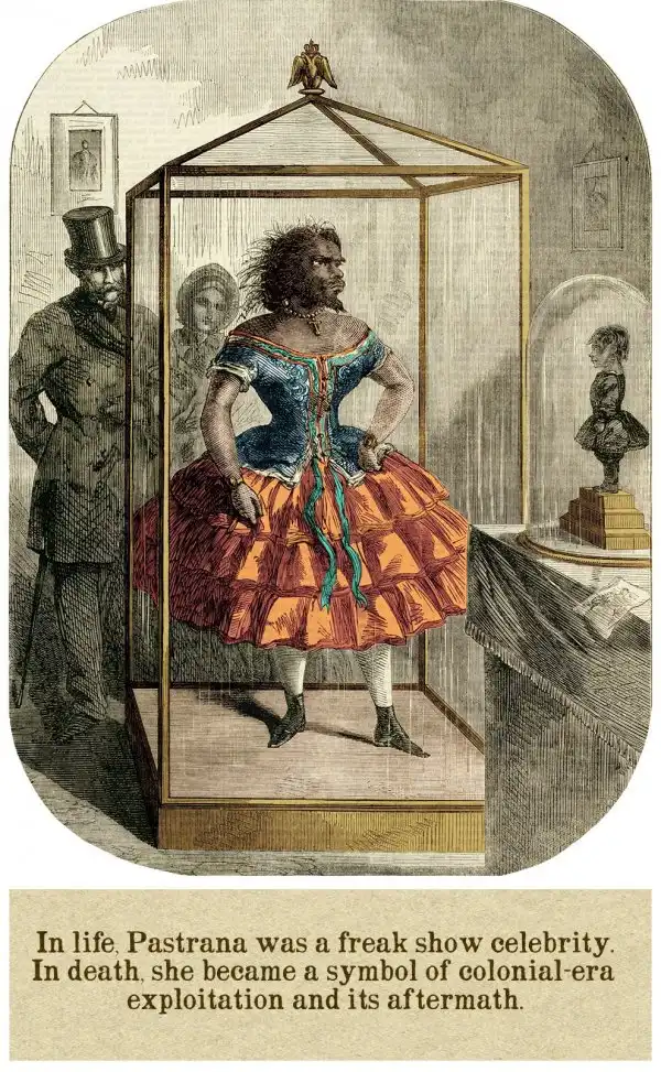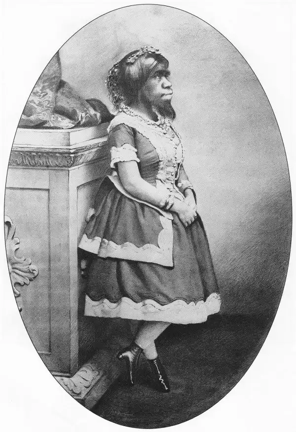 Юлия (правильно Хулия) Пастрана родилась примерно в 1834-м (точно не выяснено) в Мексике. Публике рассказывалось, что полуребёнка-полуобезьяну нашли в джунглях и прочая лабуда. На самом деле – обычная крестьянская семья из местных индейцев, необычная дочка воспитывалась, как все тамошние деревенские девушки – грамоту освоила уже взрослой, зато стряпала и шила сызмальства. Однако внешность! Как диковину Юлию забрал к себе в дом служанкой местный губернатор. В городе она попалась на глаза какому-то американцу, прикинувшему, что существо с такой наружностью – золотое дно. В США Юлия сменила несколько хозяев, была вывезена на гастроли в Англию, там её заприметил и перекупил некий Теодор Лент. Он бородоносицу начал раскручивать как своеобразную звезду: научил петь, танцевать, играть на музыкальных инструментах, «под неё» писались пьески… Бриллиант в хорошей оправе ценнее, чем просто бриллиант. Росла слава, росли сборы.