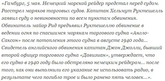 Заметка означала, что безымянный виновник дрейфа двух матросов судна «Англо-Саксон» (SS Anglo Saxon) в спасательной шлюпке в течение 70 дней, чья потрясающая история облетела все газеты в США и Великобритании и о которых в 1941 году вышла книга, наконец-то обрёл имя. Она также означала, что в истории военно-морского флота Германии появился первый и единственный командир надводного боевого корабля, обвиненный в военных преступлениях, совершенных в открытом море. Им стал командир вспомогательных крейсеров кригсмарине «Виддер» (HSK 3 Widder) и «Михель» (HSK 9 Michel) капитан цур зее резерва Хельмут фон Руктешелль (Hellmuth von Ruckteschell).