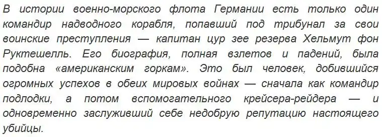 Хельмут фон Руктешелль умер первым из выживших в войне рейдеров и не оставил воспоминаний, в которых объяснил бы мотивы своих поступков. Личность Руктешелля, суд над ним и выдвинутые обвинения до сих пор являются предметом ожесточенных споров. Возможно, после изучения изложенного ниже жизненного пути осужденного рейдера читатель сам сделает выводы об этом человеке. Руктешелль не удостоился особых упоминаний у высших чинов кригсмарине – лишь адмирал Фридрих Руге вскользь упомянул о нем как о «превосходном моряке с натурой художника». Увы, за этим «превосходным моряком» еще со времен Первой мировой тянулась дурная слава, которая не сделает чести ни одному солдату, и тень смертного приговора преследовала его задолго до гамбургской весны 1947 года…