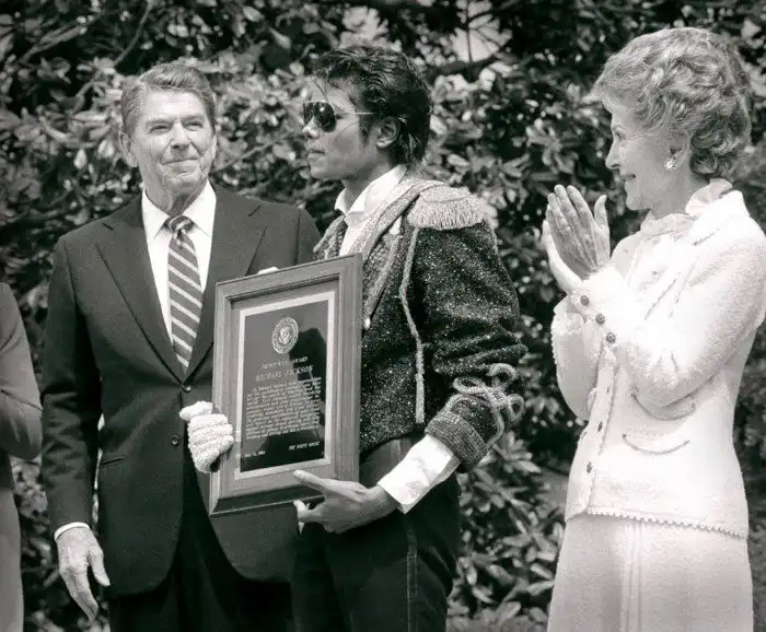 Май 1984 года, Джексон принимает награду от президента США Рейгана в Белом доме. Джексона чествовали как пример для американской молодежи, а его хит «Beat It» стал гимном компании по борьбе против вождения в нетрезвом виде. (Bettmann/Corbis)