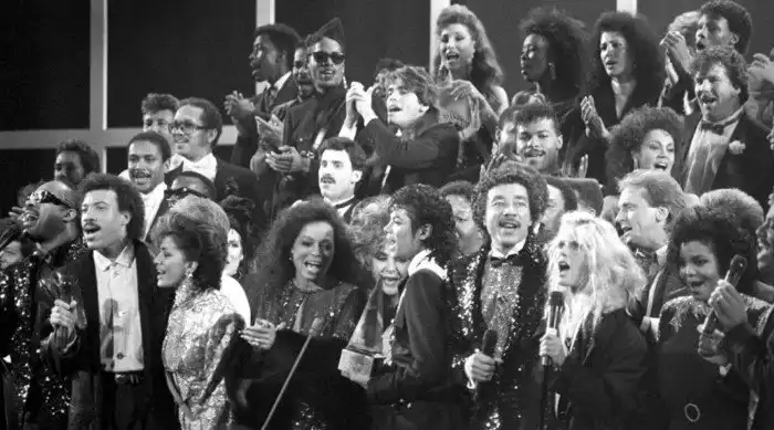 Звезды эстрады и кино совместно исполняют песню «We Are the World», чтобы обратить внимание мира на голод в Эфиопии. Майкл Джексон в центре. Также вместе с ним выступали Стиви Уандер, Лайонел Риччи, Дайана Росс, Элизабет Тейлор, и многие другие. Сестра Джексона – Джанет, в правом нижнем углу фото. (Bettmann/Corbis)
