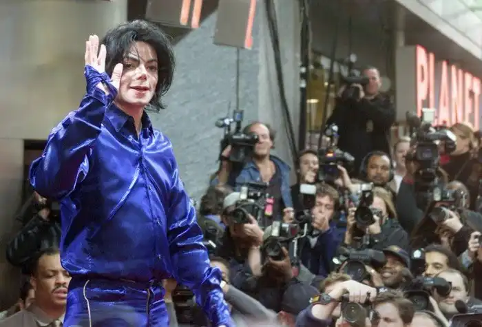 Майкл Джексон позирует перед фотографами на презентации своего альбома «Invincible» на Таймс Сквер в Нью-Йорке в ноябре 2001 годе. Новый альбом, который вышел 30 октября того года, стал самым дорогим из когда-либо записанных альбомов и был принят критиками и фанатами лучше, чем альбом «HIStory» 1995 года. (Brad Rickerby/Reuters/Corbis)
