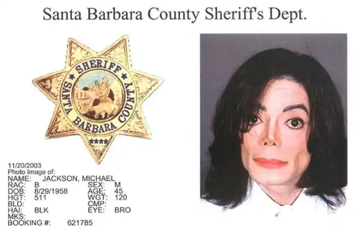 Фотография Джексона сделанная в полицейском участке округа Санта-Барбара 30 ноября 2003 года. В 2003 году Джексон документально признал, что мальчики спали в его постели. Вскоре прокурор начал проверку по обвинению Джексона в растлении малолетних. В ноябре полицейские появились на ранчо «Неверленд» для обыска, и несколькими днями позже Джексон был арестован. (Santa Barbara County Sheriff’s D/Reuters)