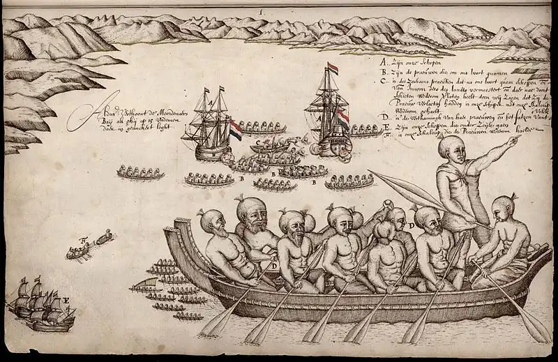 Каноэ маори и корабли Абеля Тасмана в Бухте убийц