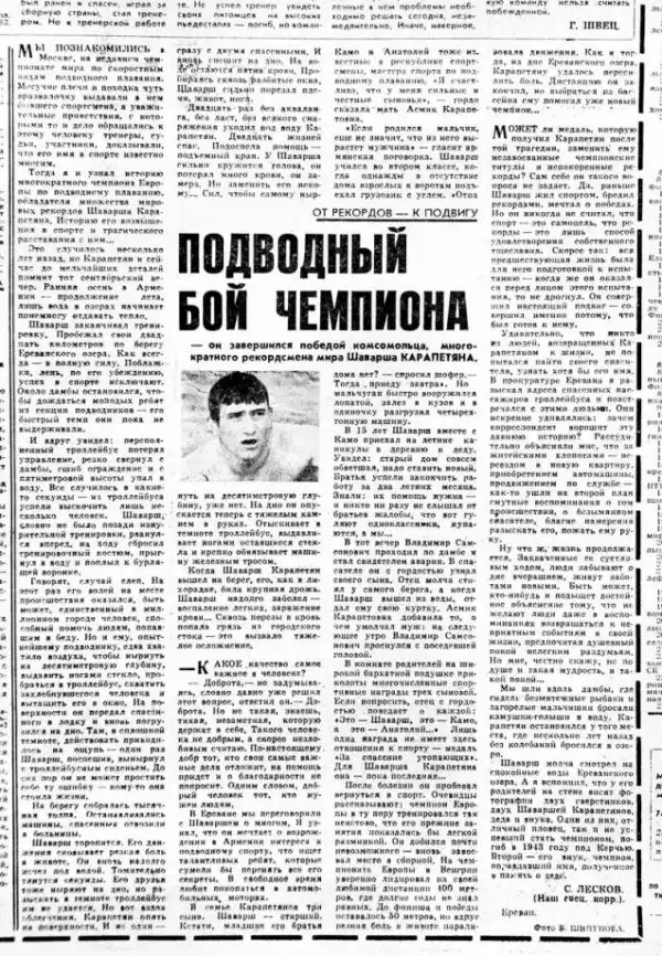 В 1982 году мы познакомились с корреспондентом «Комсомольской правды» Сергеем Лесковым. Я приехал из Еревана в Москву на чемпионат Европы. В бассейне старший тренер сборной СССР познакомил нас, а когда я отошел, рассказал Лескову мою историю. Журналист попросился в командировку в Ереван, собрал материал и написал о той трагедии. Вот тогда, после статьи в «Комсомолке», спасенные люди меня нашли. Мне было приятно видеть их живыми и здоровыми.