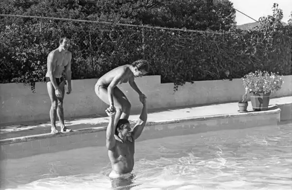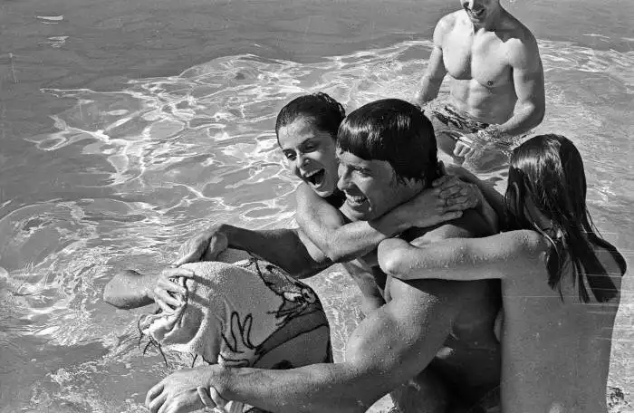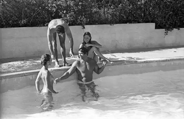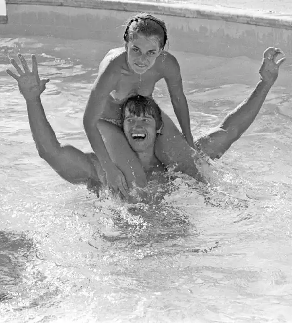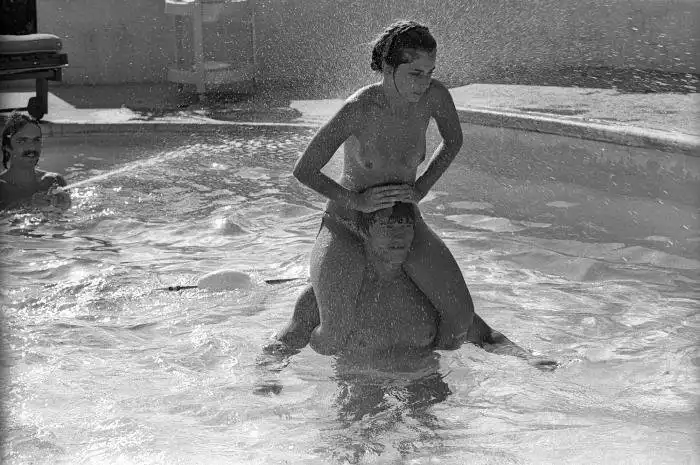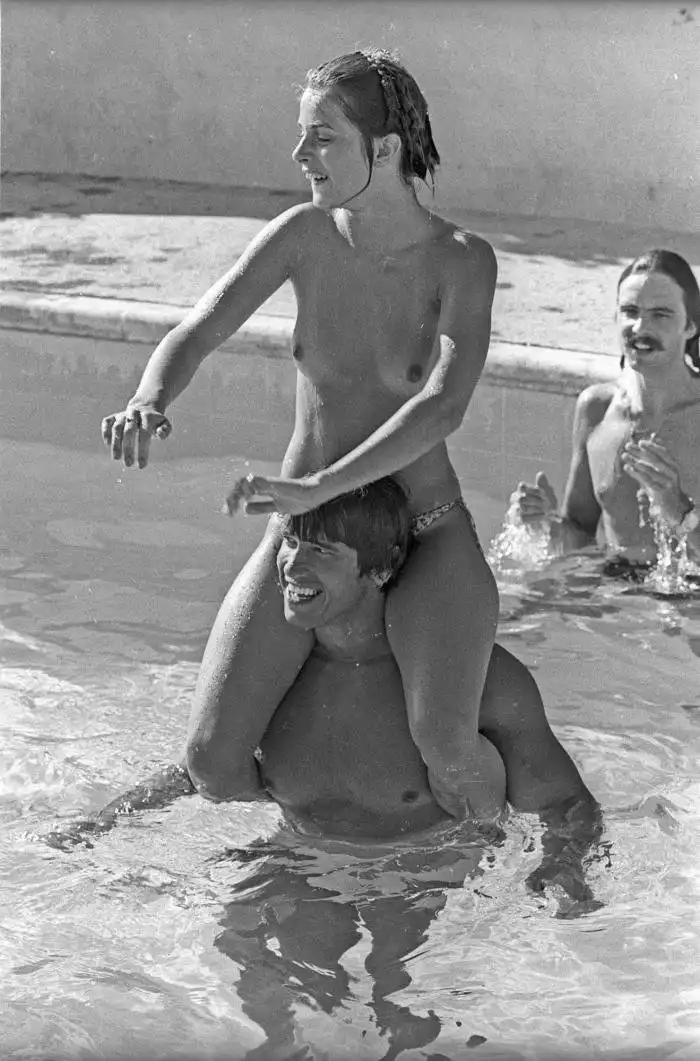 В 76-м на экраны вышел фильм "Оставайся голодным", за роль в котором, Шварценеггеру была вручена награда "Золотой глобус" как самому многообещающему актёру. Фото сделанны в перерыве между съемками. Кроме Арни и начинающей в то время свою карьеру 15-летней Настасье Кински, с ними в басейне резвятся актер Джонни Кроуфорд и Дебра Тейт. Дебра была младшой сестрой актрисы Шерон Тейт - супруги кинорежиссёра Романа Полански, которая в 1969-м, находясь на восьмом с половиной месяце беременности, была зверски убита в собственном доме членами коммуны "Семья" Чарльза Мэнсона.