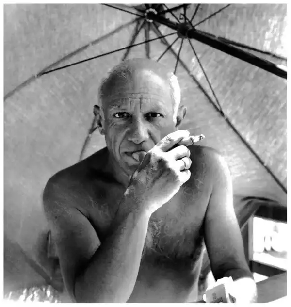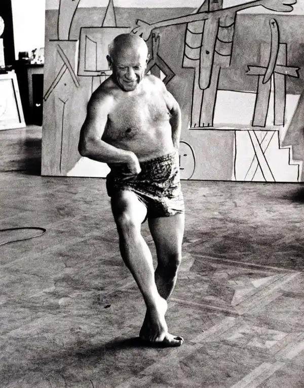 Пикассо танцует на фоне картины «Купальщицы Ля Гаруп», вилла Калифорния, Канны, 1957 год, Фото Дэвид Дуглас Дункан