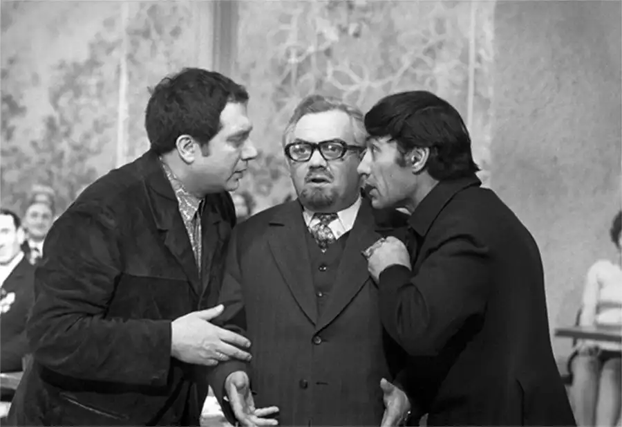Артисты из телевизионного театра миниатюр "Кабачок тринадцать стульев": Зиновий Высоковский, Борис Рунге и Спартак Мишулин во время записи праздничной телепередачи "Голубой огонек". 1974 год. Фото С. Герасимова /Фотохроника ТАСС/