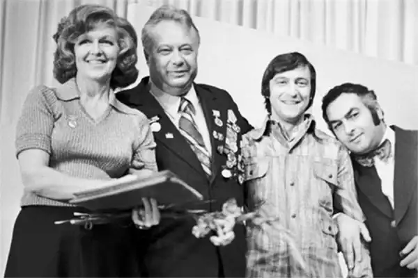Телеведущая Валентина Леонтьева, спортивный комментатор радио и телевидения Николай Озеров и артисты эстрады Геннадий Хазанов и Левон Оганезов. 6 сентября 1972 года. Фото Валерия Шустова /РИА Новости/