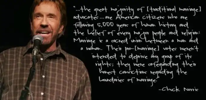 «Крутой Уокер» — известный активист в борьбе против гомосексуализма. "... Большинство традиционных сторонников брака ... являются американские граждане, следующие 5000 лет истории человечества ..." сказал Чак Норрис перед Национальной организацией брака на мероприятии, которое числит себя анти-ЛГБТ. Он их знаменитый пресс-секретарь и спикер, что неудивительно, если учесть его историю выступлений против ЛГБТ-сообщества.