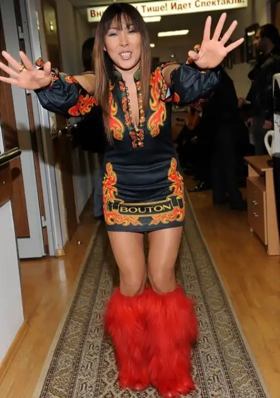 В этом образе все сложилось так жутко, что в итоге выглядит даже пугающе гармонично — платье с узором, напоминающим хохлому, унты из лап красного мамонта и ковер, на котором позирует Анита.