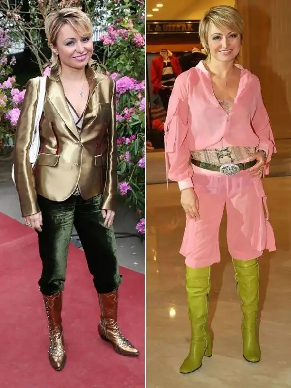 Кажется, все «нулевые» Катя не снимала сапоги — слева, видимо, зимний вариант образа с ними (празднично-золотой), а справа — летняя,«облегченная» версия.