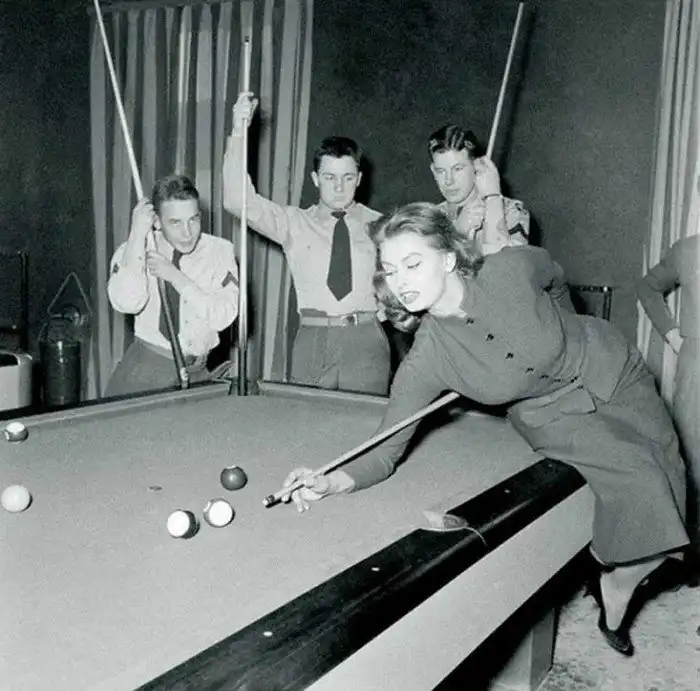 Софи Лорен демонстрирует американским солдатам свое мастерство игры на бильярде, Ливорно, 1954 год