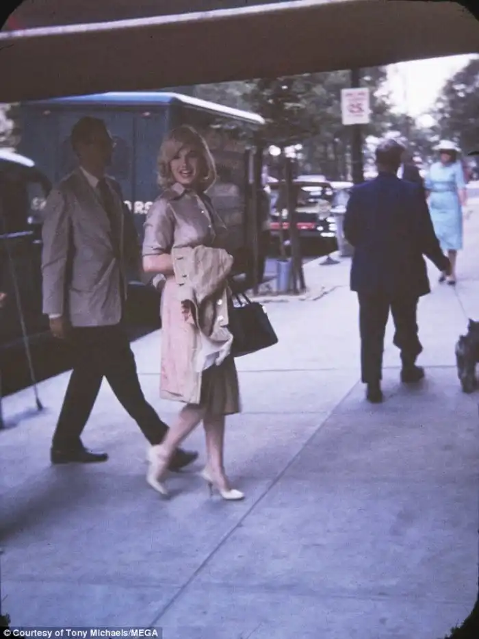 Этот снимок также сделан Фридой Халл 8 июля 1960 года. Монро, приехавшая на студию, тщательно прикрывает живот плащом.