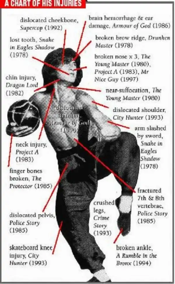 Не удивительно, что за многие года Джеки успел повредить практически все части тела: он ломал нос трижды, получал травмы рук бессчетное количество раз, многократно травмировал колени.