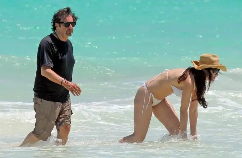 Папарацци сделали снимки влюбленных во время купания: актер очень трогательно делал знаки внимания своей подруге, одетой в соблазнительный белый купальник. При этом сам Пачино, уже давно потерявший спортивную форму, предпочитал находиться в воде в майке и шортах.