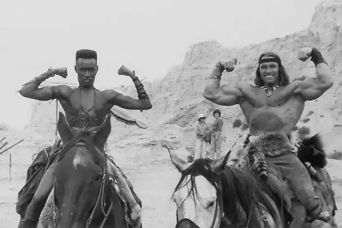 Арнольд Шварценеггер берет уроки фехтования на мечах для роли в фильме «Конан-варвар»