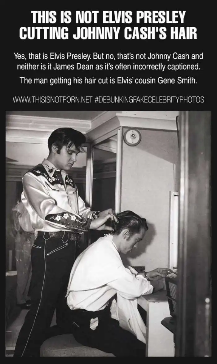 «Да, это Элвис Пресли, но стрижет он не Джонни Кэша или Джеймса Дина, как многие считают. Элвис стрижет своего кузина Джина Смита».