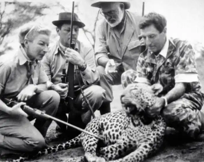 Эрнест Хемингуэй со своим трофеем - африканским леопардом.