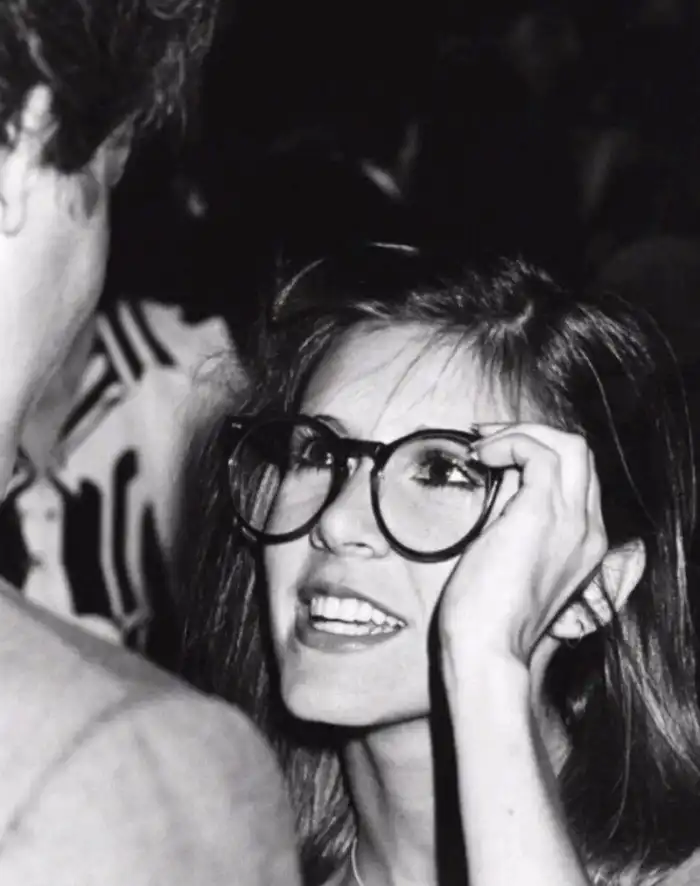 Кэрри Фишер "Прицесса Лея" примеряет очки Харрисона Форда "Хана Соло" .