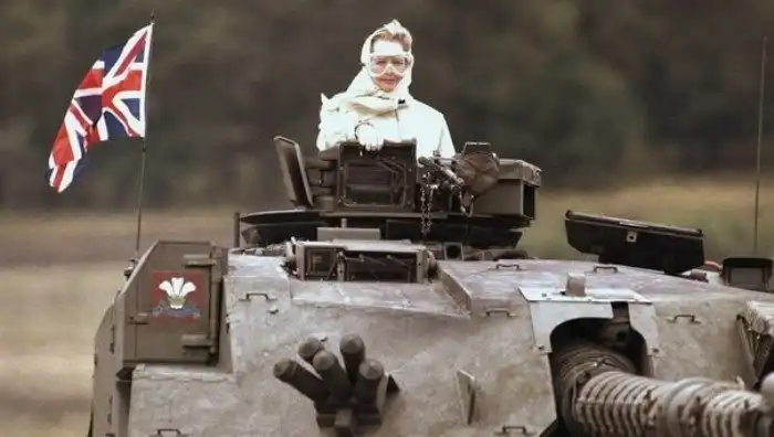 Маргарет Тэтчер в танке "Челленджер" во время визита на британскую военную базу в Фаллингбостеле, 17 сентября 1986 года.